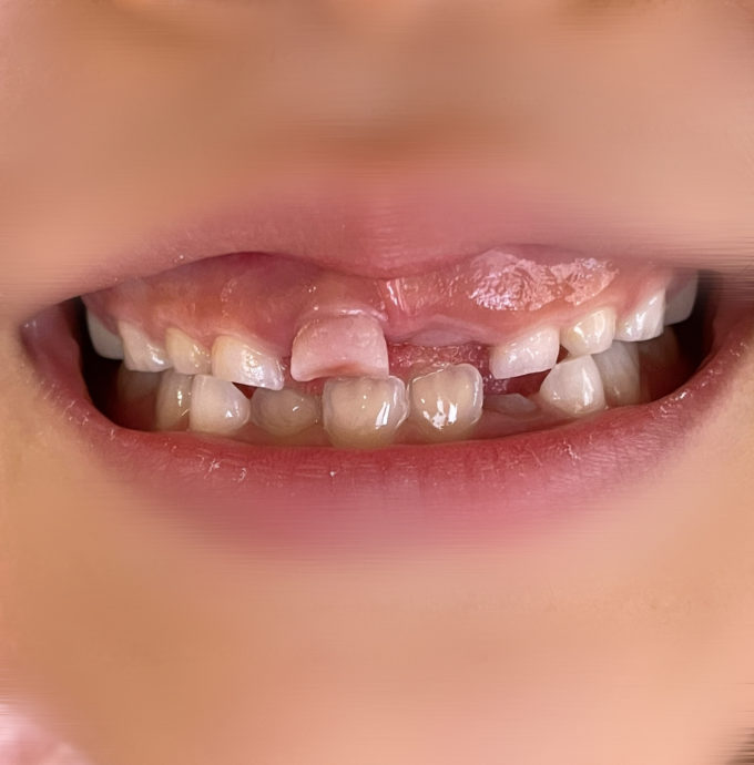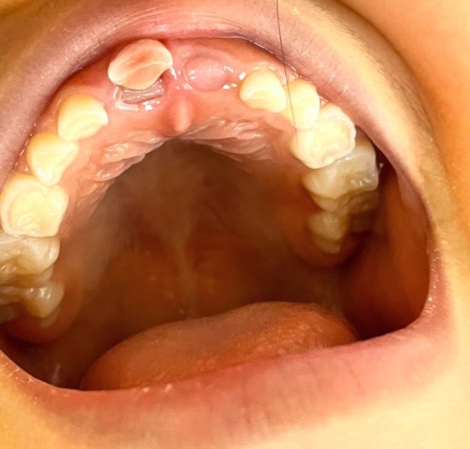 【2枚歯】乳歯の裏に永久歯が生えてきた!長女歯列矯正記録vol.1 長女(ぷっぷく)/ 二枚歯 正面から見るとこんな感じ。 グラグラの乳歯(うすピンクがかっている) 永久歯が生えてきたことで、根が溶けて抜けるだけなのに抜けない。 根が溶けて歯茎が歯の中に少し入り込んでいるので、歯がピンク色に見えるらしい。 そして、歯の裏はこう。 見えますか? 上の乳歯のすぐ裏に永久歯が顔を出しています。 このままではよくないので抜いてもらうことにしました。 長女歯列矯正記録、次回は二枚歯の抜歯! ドキドキ…初の抜歯… Pages: 1 2