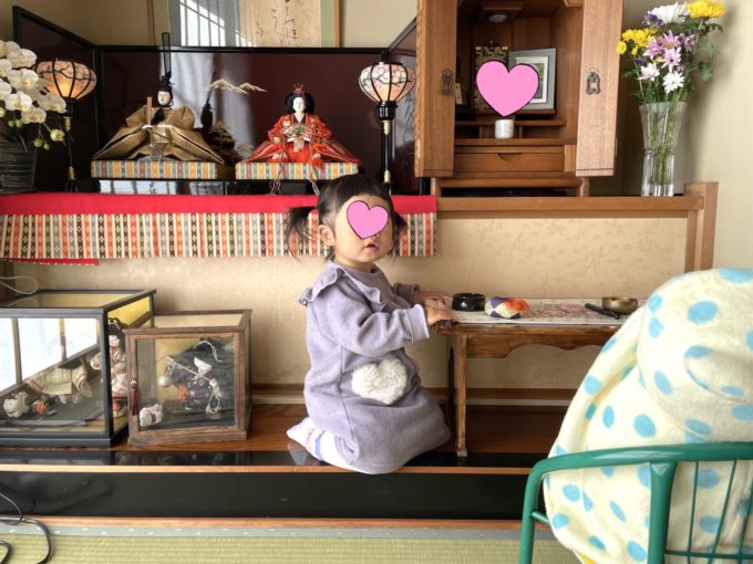 次女は仏壇のテーブルでおままごとしてた。