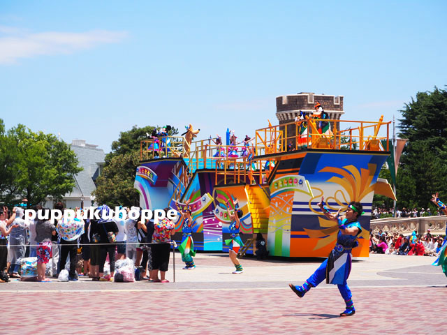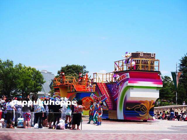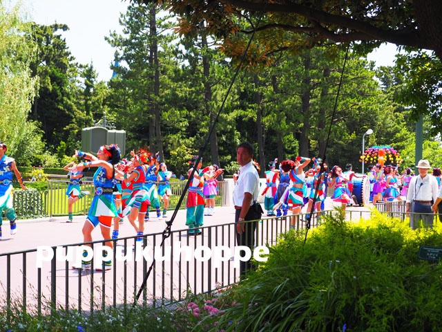 キャラクターやダンサーさんがホースみたいなやつでかけてくるので